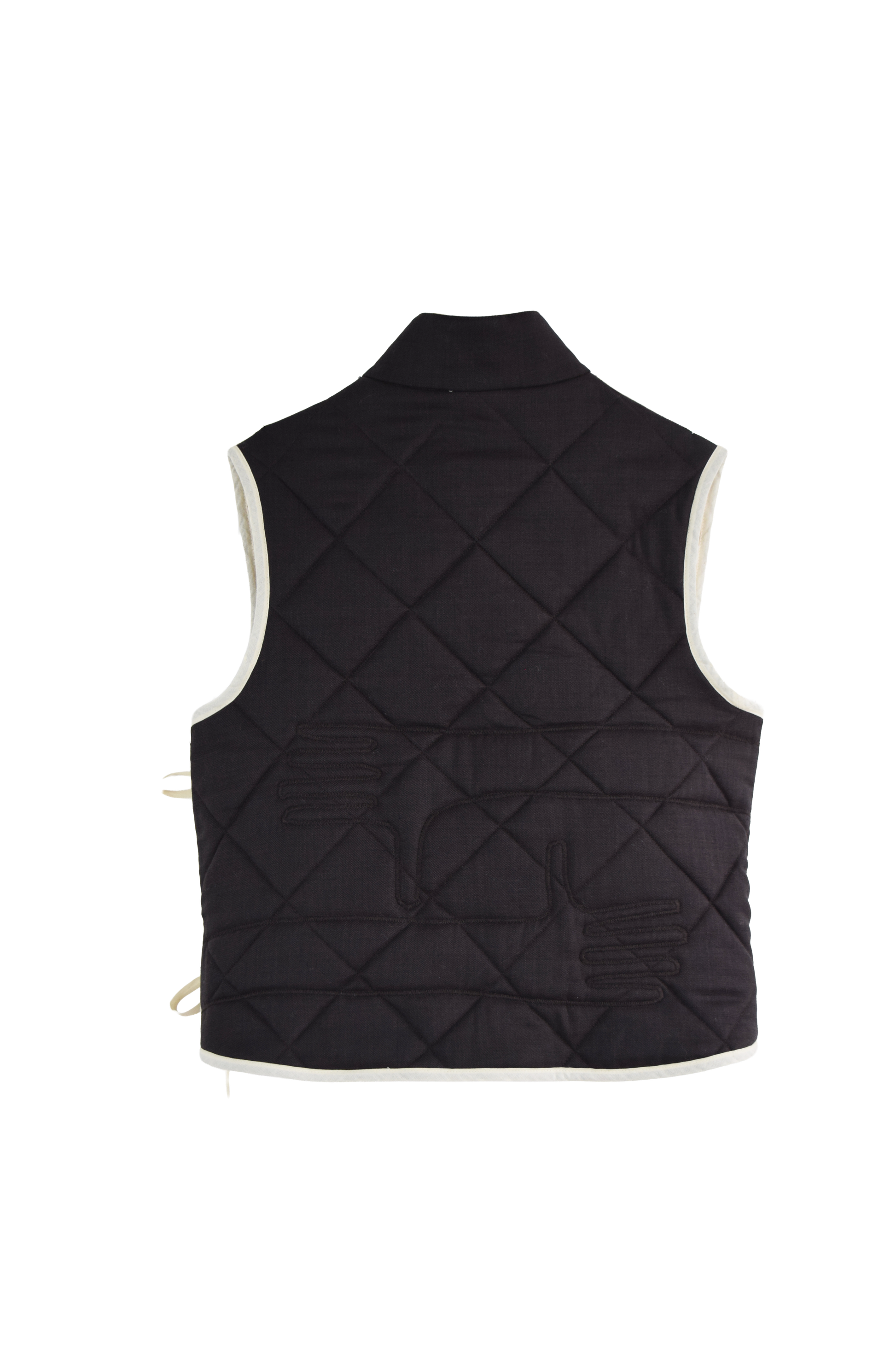 Cette veste unique a été confectionnée à partir de couvertures upcyclées ayant eu une histoire. Shanti signifie «paix» en hindi, à l’image de ces mains symbole de bienveillance.