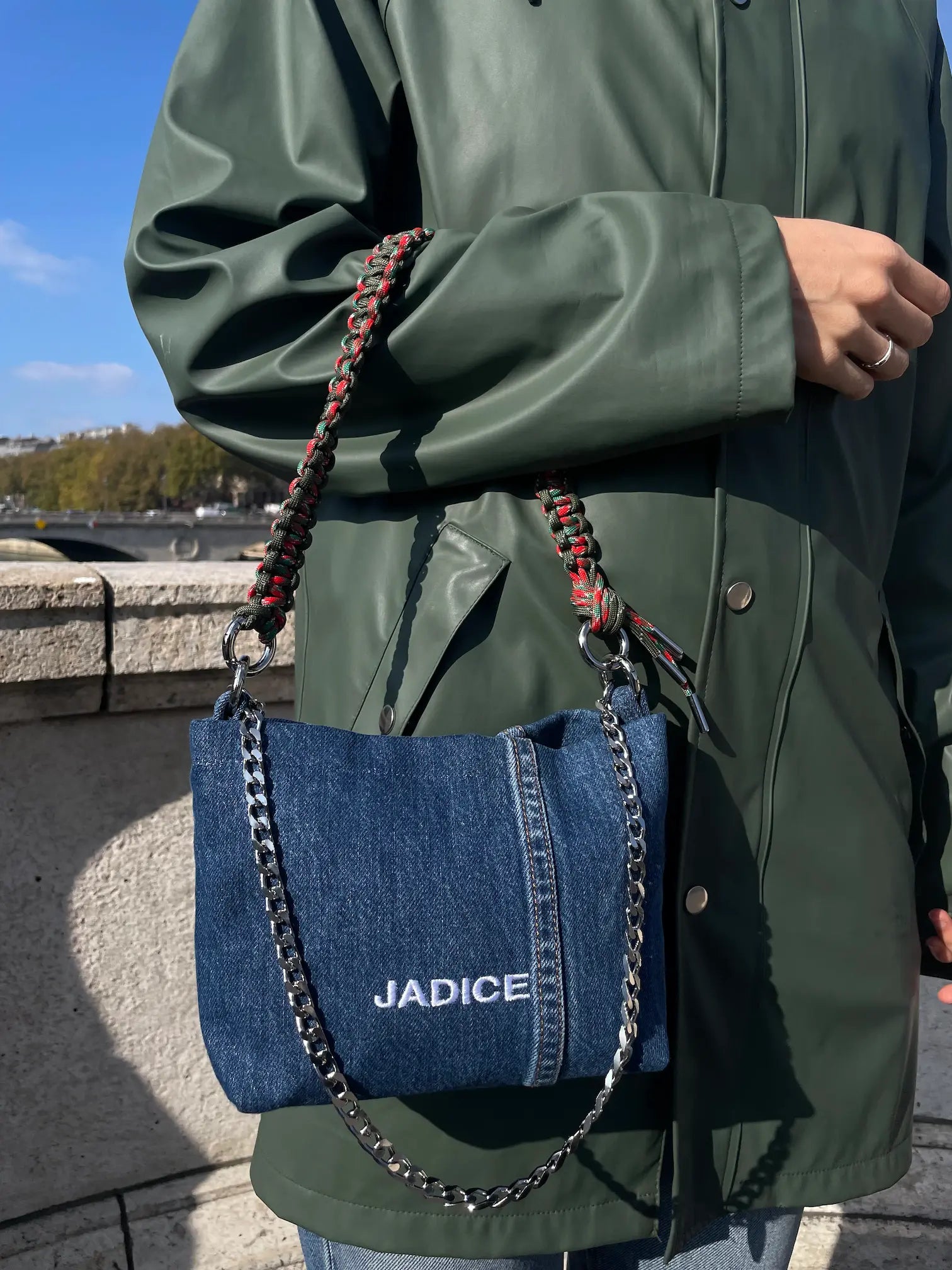SAC ZEPHYR JEAN BLEU FONCÉ - ANSE MACRAMÉ KAKI ET ROUGE